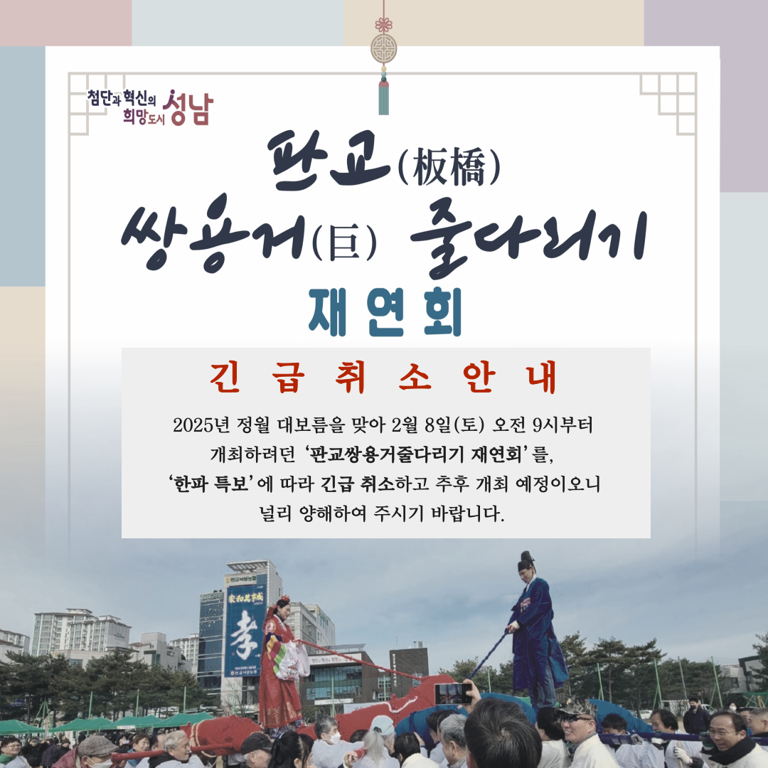 2025¡¸ÆÇ±³ ½Ö¿ë°Å(ËÝ) Áٴٸ®±â¡¹À翬ȸ ±ä±Þ Ãë¼Ò ¾È³»