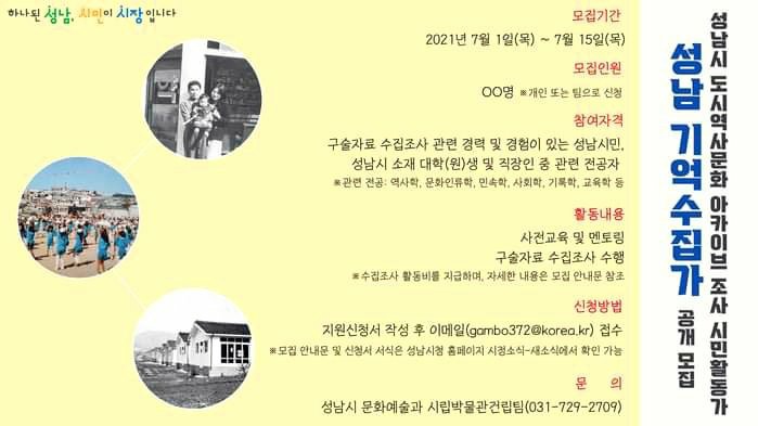 1631 ¼º³²½Ã, µµ½Ã¿ª»ç¹®È­ ÀÚ·á ±¸Ãà ½Ã¹Î È°µ¿°¡(¼º³² ±â¾ï¼öÁý°¡) ¸ðÁý ¿î¿µÀÚ 2021.07.02 1130
