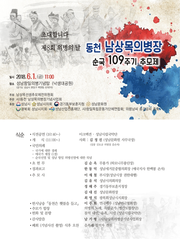 1356 ³²»ó¸ñ ÀǺ´Àå ¼ø±¹ 109ÁÖ±â Ã߸ðÁ¦ ¿­·Á... ¿î¿µÀÚ 2018.05.23 1693