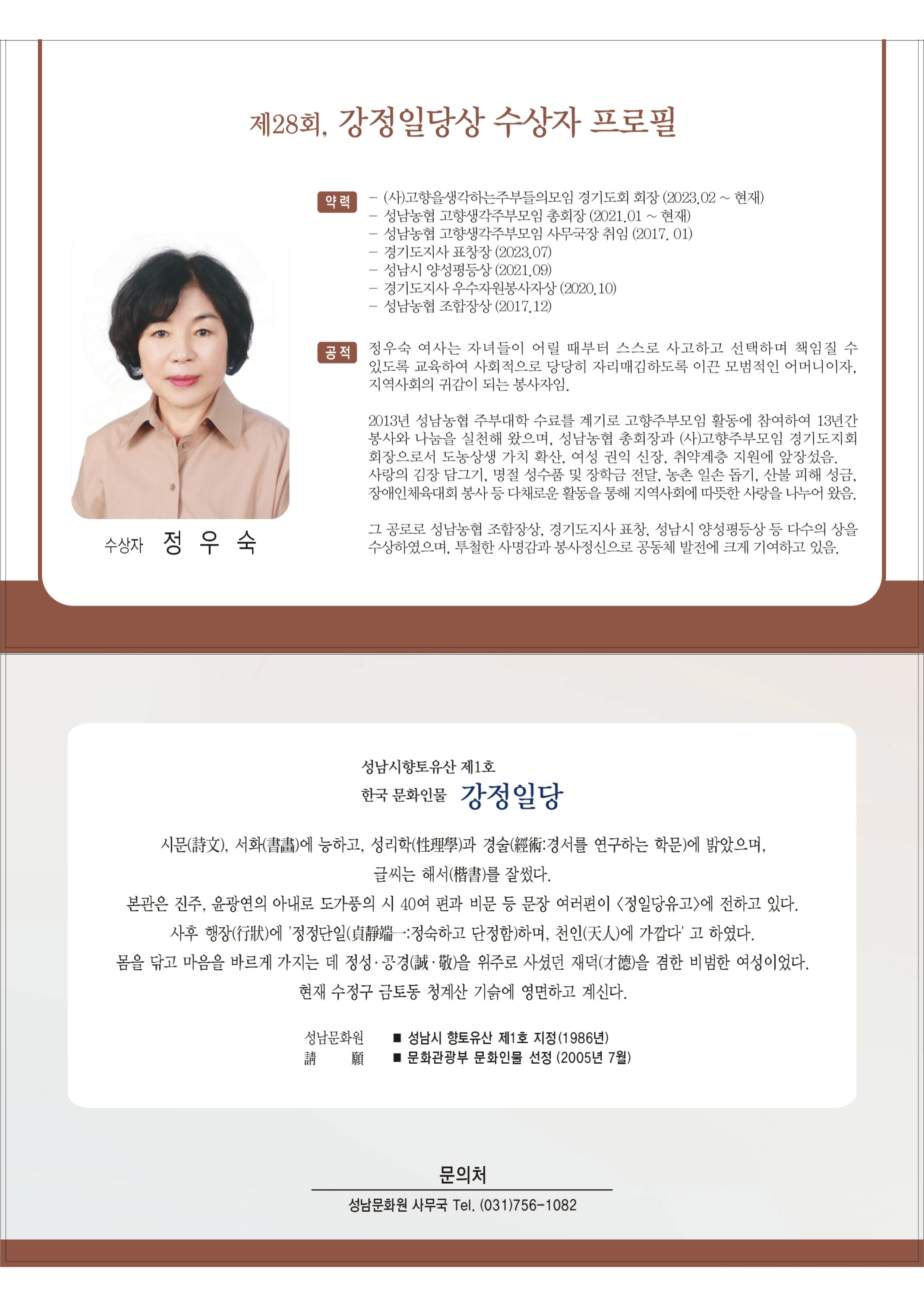 ¡®Á¦28ȸ °­Á¤ÀÏ´ç»ó¡¯ ½Ã»ó½Ä  - °íÇâ»ý°¢ÁֺθðÀÓ °æ±âµµÈ¸ ¹× ¼º³²³óÇù Á¤¿ì¼÷ ȸÀå , ¼ö»óÀÚ·Î ¼±Á¤ -   ¼º³²¹®È­¿ø(¿øÀå ±è´ëÁø)Àº