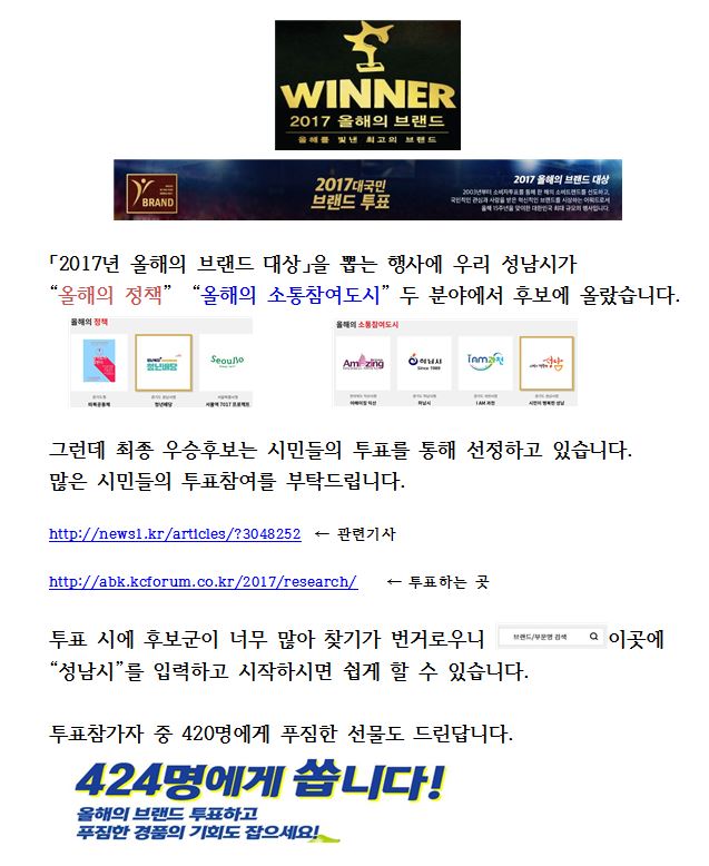 1268 2017 ºê·£µå ´ë»ó, ¼º³²½Ã 2°³ ºÐ¾ß Èĺ¸¿¡ ¿Ã¶ó ¿î¿µÀÚ 2017.07.20 958